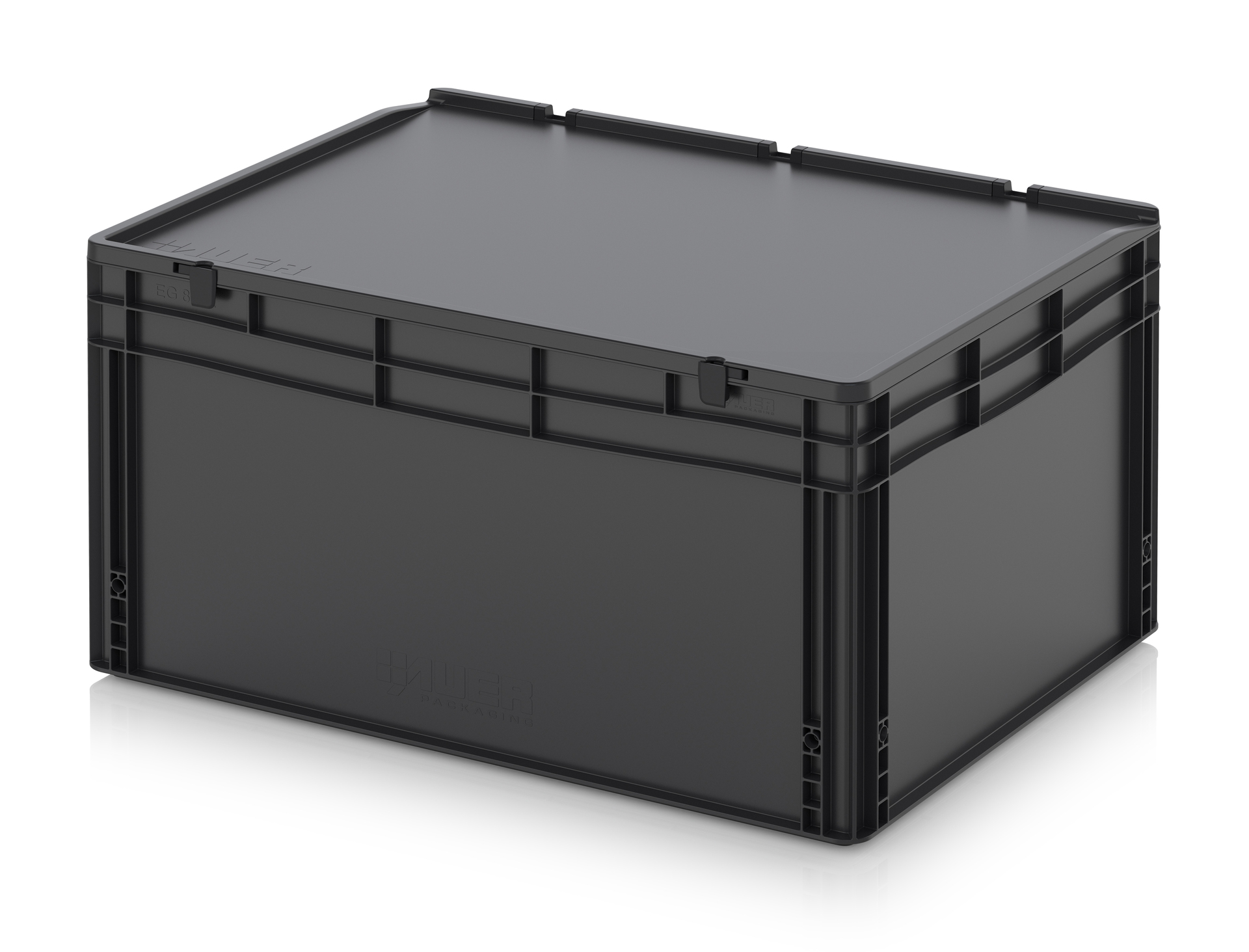 Евроконтейнер с ESD-защитой производства компании AUER Packaging изготавливается из антистатической пластмассы, что делает его пригодным, в частности, для надежного хранения и транспортировки электронной продукции.