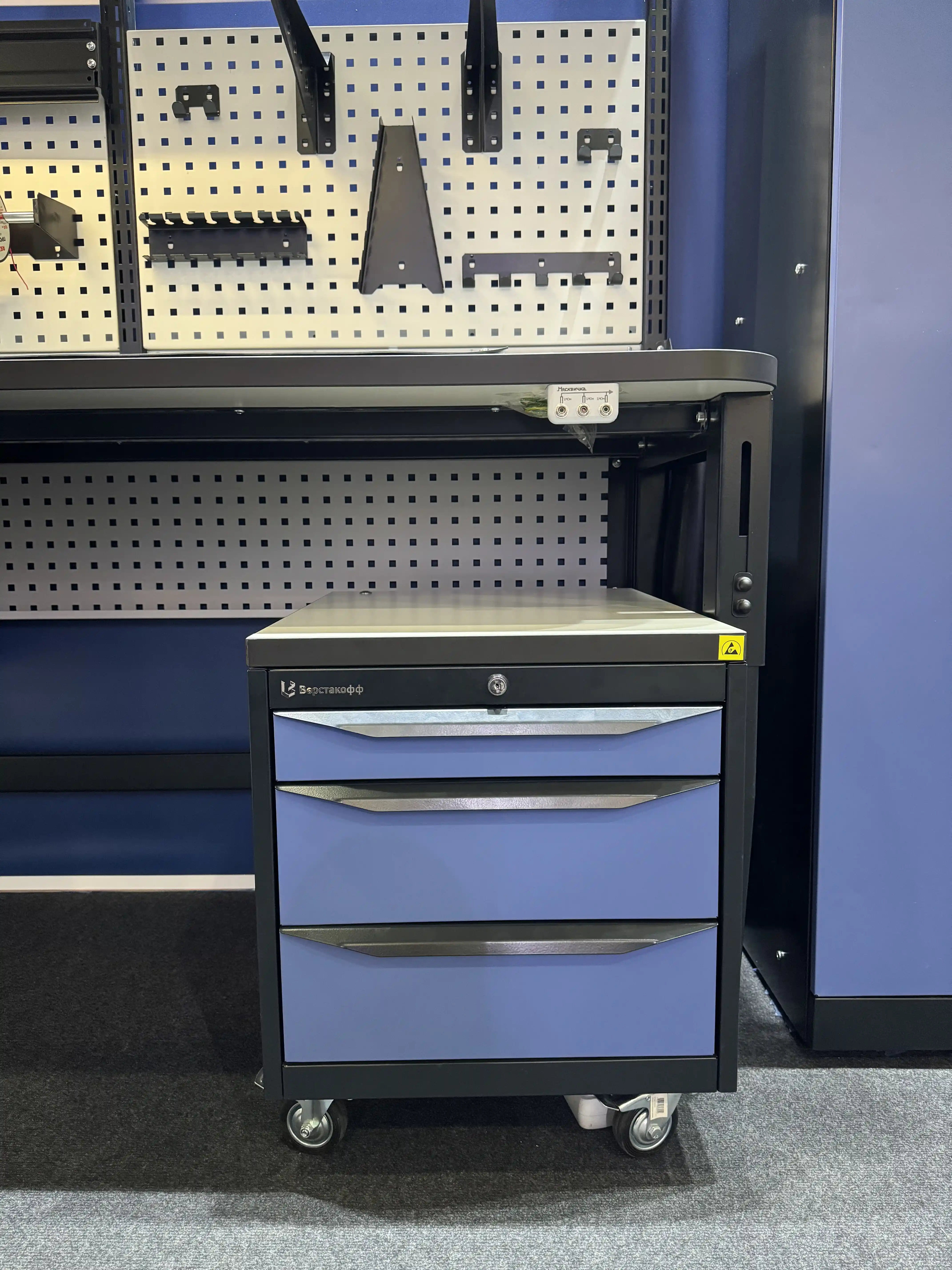 Все элементы корпуса покрыты электропроводящей антистатической краской, которая обеспечивает электропроводность. Сверху модуля установлена антистатическая столешница. Модуль оснащен четырьмя колесами, система обеспечивает эффективное заземление для снижения статического заряда и предотвращения его передачи на другие поверхности.