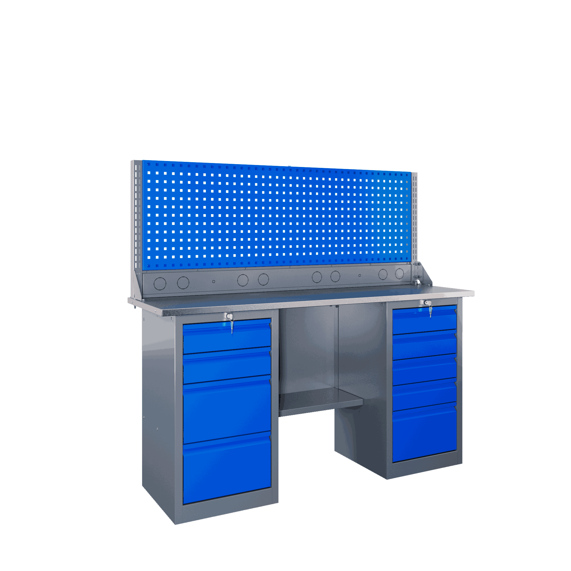 Хранение инструмента реализовано с умом: две вместительные тумбы поддерживают нагрузку до 45 кг на каждый ящик. Позади столешницы интегрирована полка-стенка, позволяющая держать часто используемые предметы на виду. Цвет серый, что практично для производственных помещений.