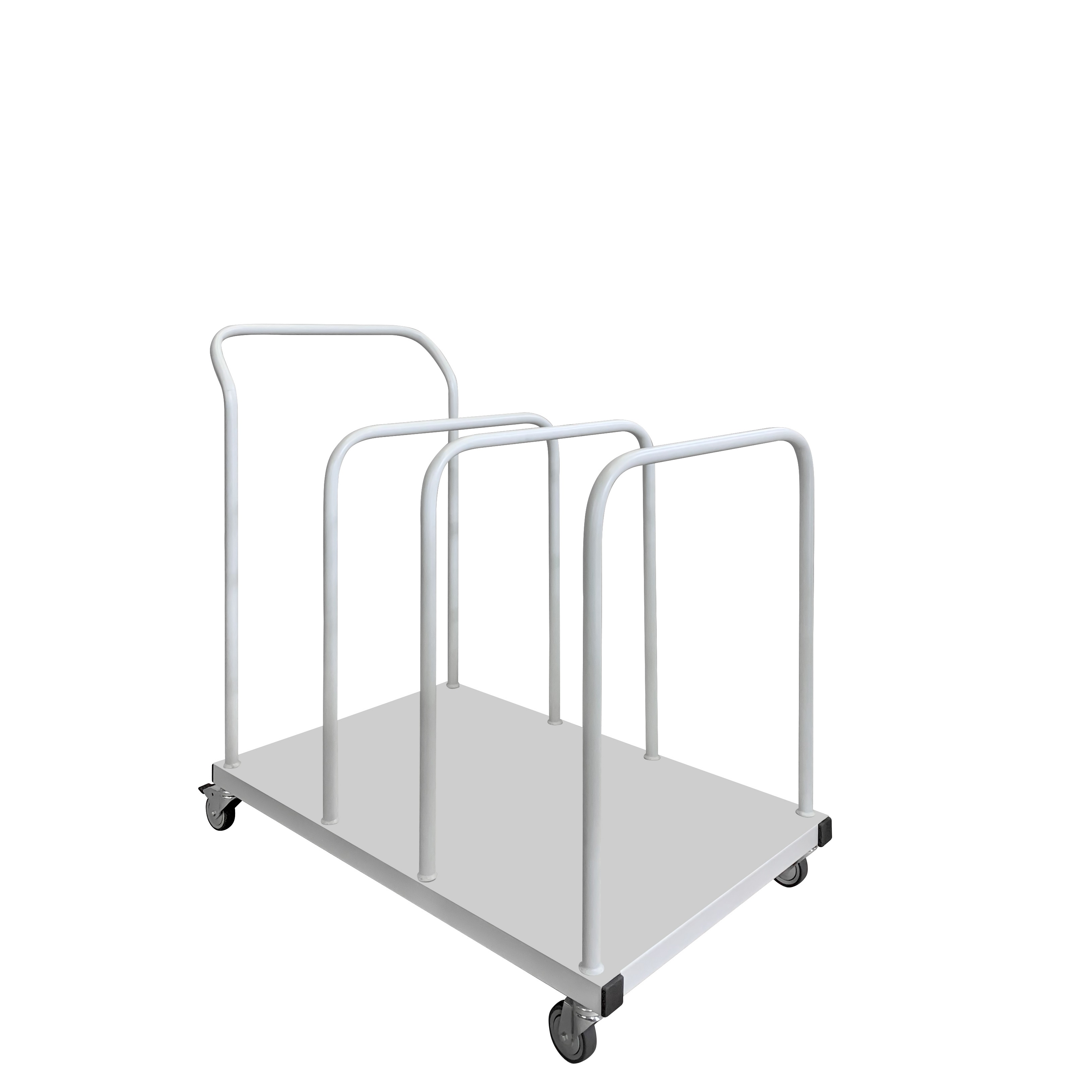 Тележка для картона ТК предназначена для хранения и транспортировки в рабочем пространстве листового картона и картонных коробок. Тележка состоит из трех секций, выполненных из стальной трубы, что позволяет выдерживать даже самые большие упаковочные коробки. Тележка имеет прочную стальную раму, четыре поворотных колеса, два из которых снабжены тормозами.