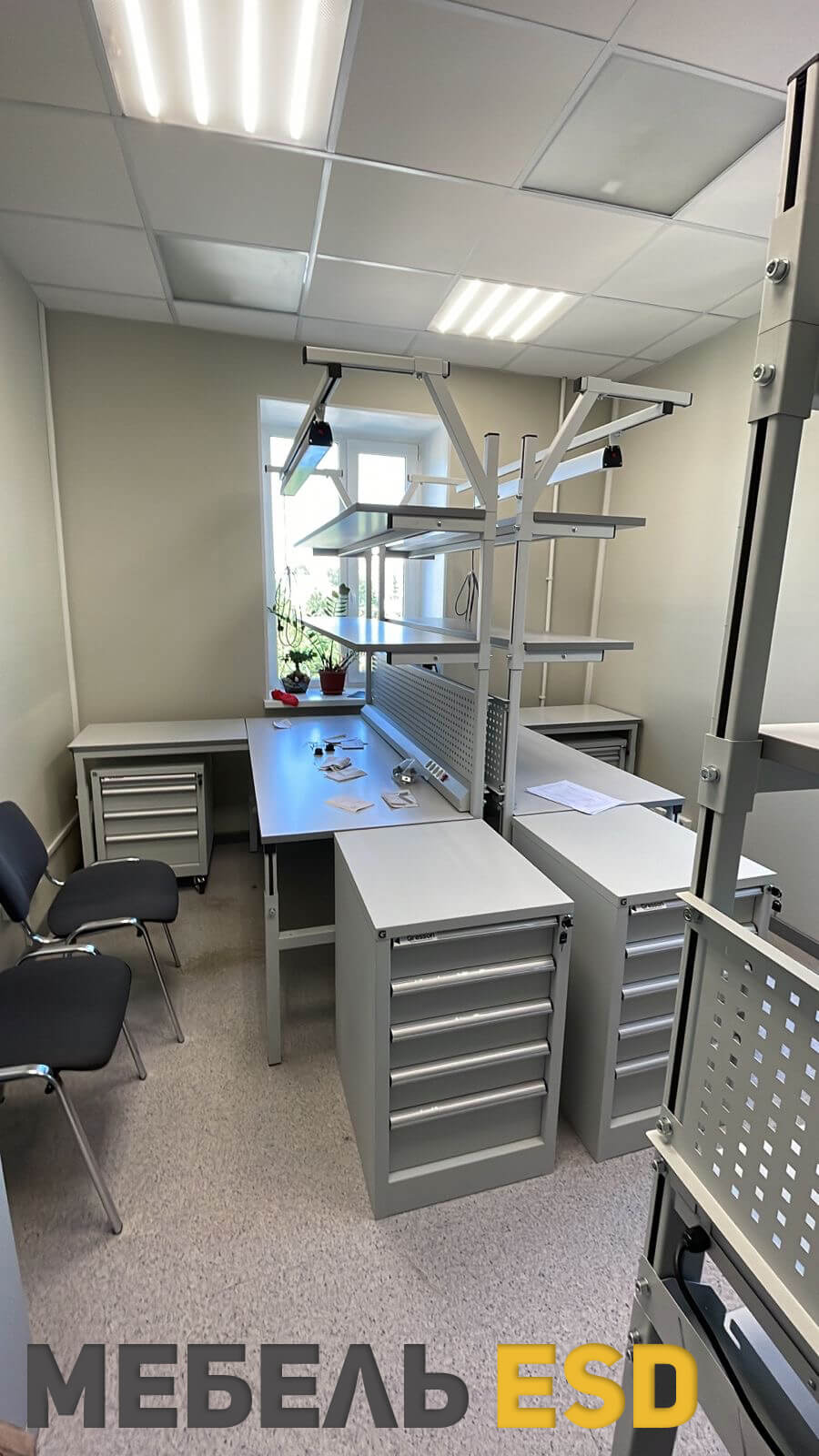 - знак ESD (Electrostatic sensitive device), обозначающий работу с материалами чувствительными к электростатическому разряду, а так же на тыльной стороне корпуса антистатической тумбы имеется заземляющий провод с клеммой.